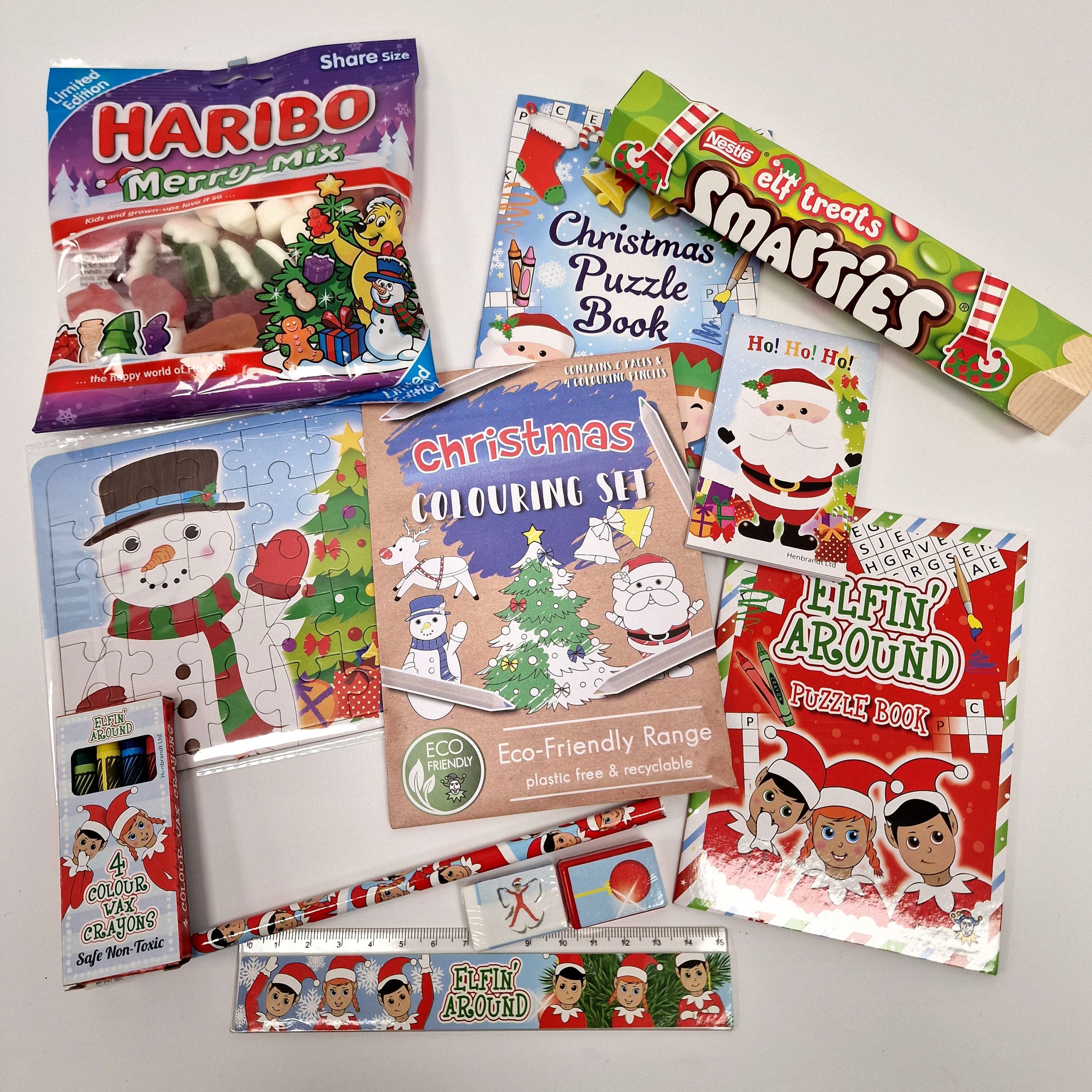 We have a large tube of Elf Smarties, large bag of merrymix haribo, Elf Crayons, Elf Puzzle, Elf Stationary set, Colouring Set , Elf Notepad and 2 puzzle books.