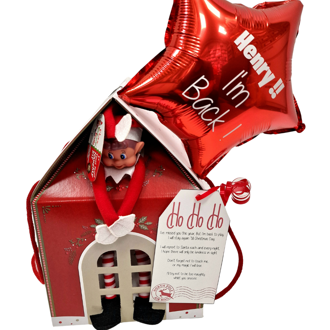A naughty elf inside a cardboard house